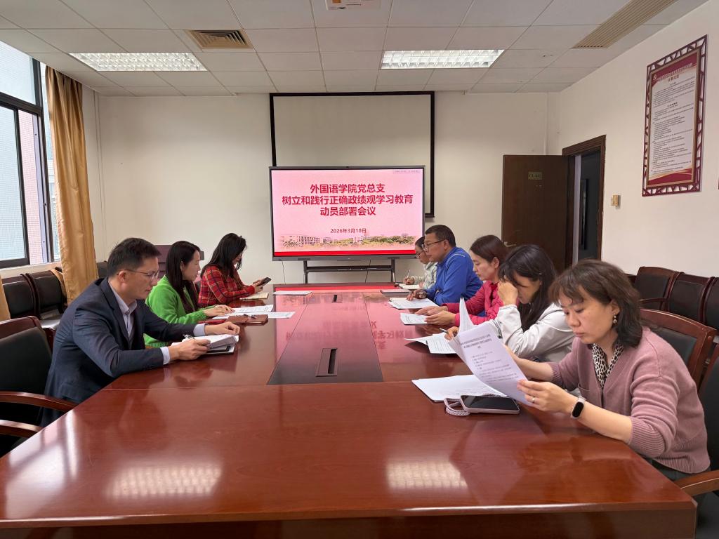 会议指出,在“十五五”规划谋篇布局的关键之年,树立和践行正确政绩观学习教育学习教育,对于推动学院各项事业高质量发展具有重要现实意义。学院党总支要切实提高政治站位,把思想和行动统一到党中央决策部署和学校党委工作安排上来,班子成员要带头学深悟透、带头践行落实,以更高标准、更严要求深刻领会正确政绩观的核心要义与实践要求。会议强调,作为教育工作者,政绩最终要体现在为党育人、为国育才和服务师生上,必须把正确政绩观贯穿学院高质量发展和干部队伍建设的全过程,结合外国语学院实际,坚持以师生为中心、坚持高质量发展、坚持实事求是、强化担当作为,以务实作风推动学院内涵式发展。